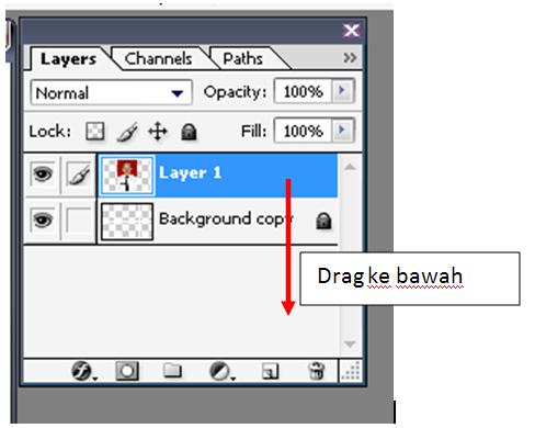 Klik Layer 1 Copy, kemudian tekan pada keyboard : CTRL + E, untuk menggabungkan layer 1 dengan layer 1 copy. Hasilnya sbb :