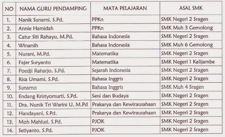 Hari Jumat, 7 Novermber 2014 bertempat di SMK Negeri 2 Sragen, dilaksanakan Pendampingan Imploementasi Kurikulum 2013, yang di ikuti lebih dari 130 peserta dari SMK kabupaten Sragen Klaster SMK Negeri 2 Sragen yaitu :