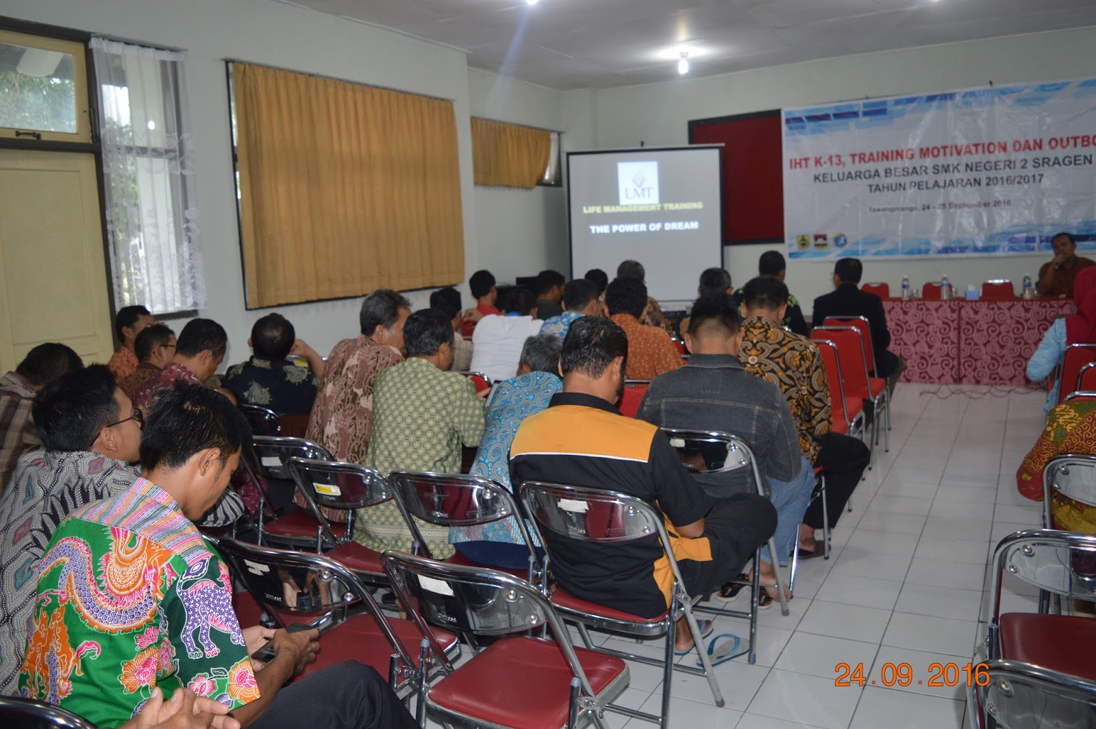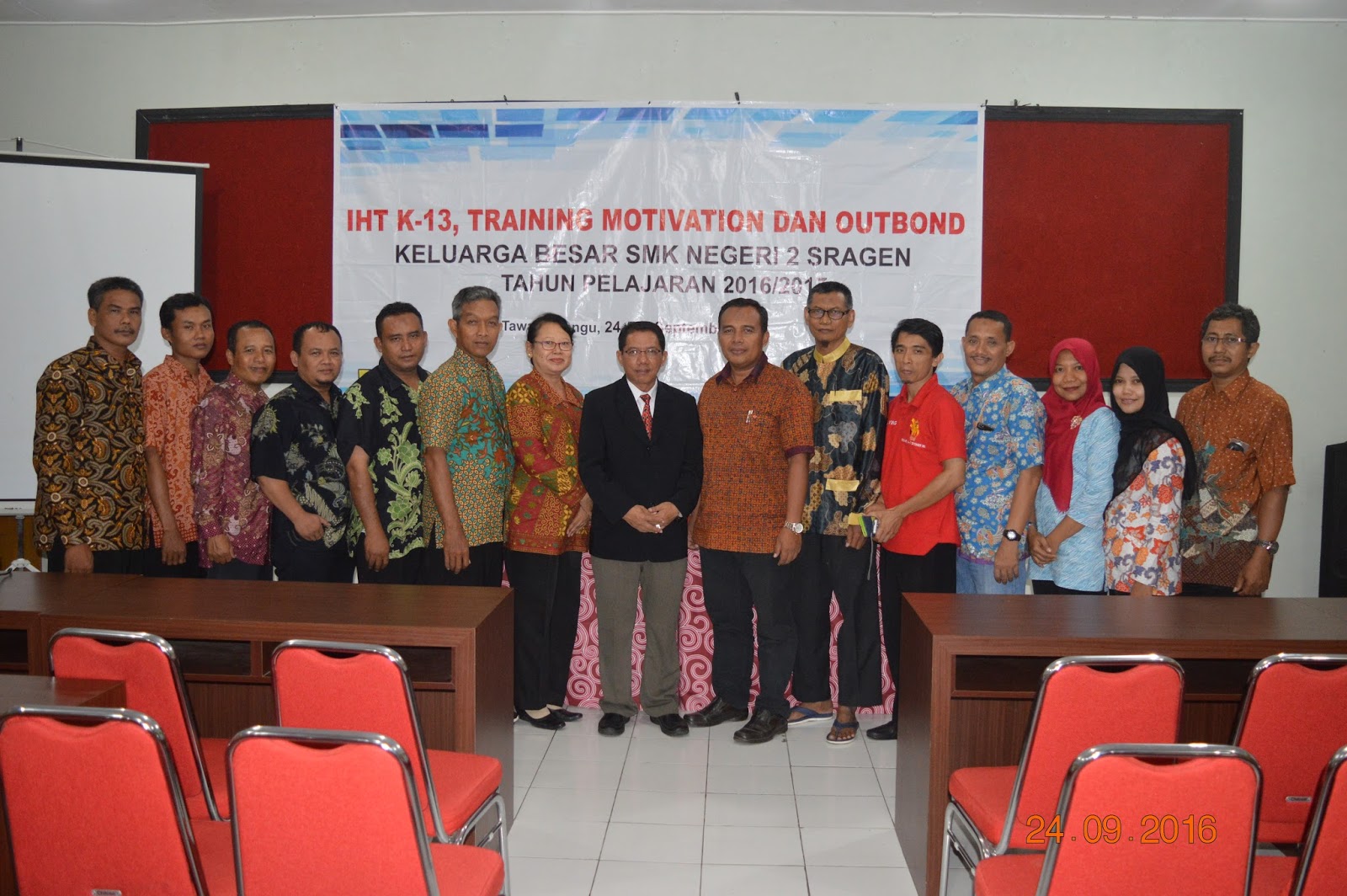 Dalam rangka meningkatkan pemahaman tentang implementasi kurikulum 2013 dan untuk meningkatkan kinerja dan semangat kerja bagi guru SMK N 2 Sragen, seksi SDM SMK Negeri 2 Sragen mengadakan kegiatan In House Training (IHT) Kurikulum 2013, Training Motivasi dan outbond keluarga besar SMK N 2 Sragen.