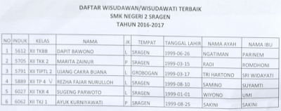 Siswa Kelas XII SMK Negeri 2 Sragen Tahun pelajaran 2016/2017 dinyatakan Lulus berdasarkan sidang pleno pada hari Selasa, 2 Mei 2017, dan dilaksankan prosesi Wisuda di Gedung Sasana Manggala Sukowati pada hari Rabu, 3 Mei 2017.