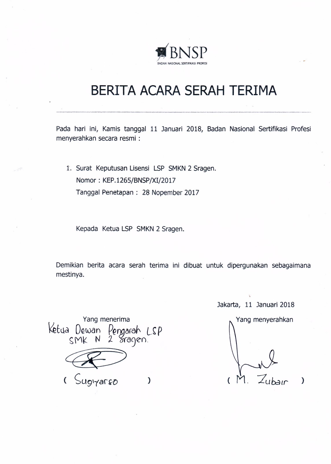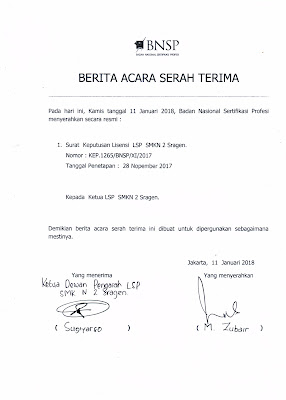 SMK Negeri 2 Sragen Menerima Lisensi BNSP dengan Nomor KEP.1265/BNSP/XI/2017