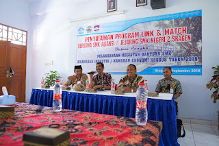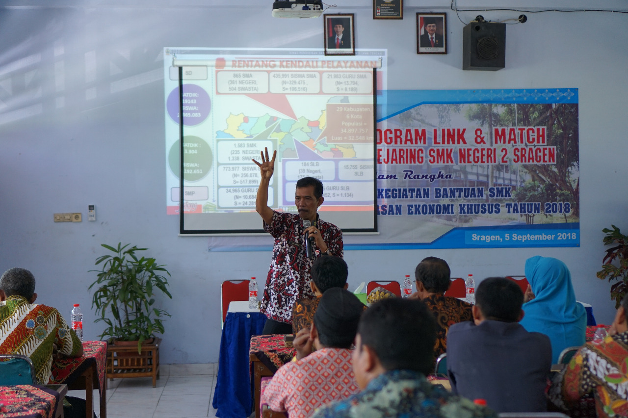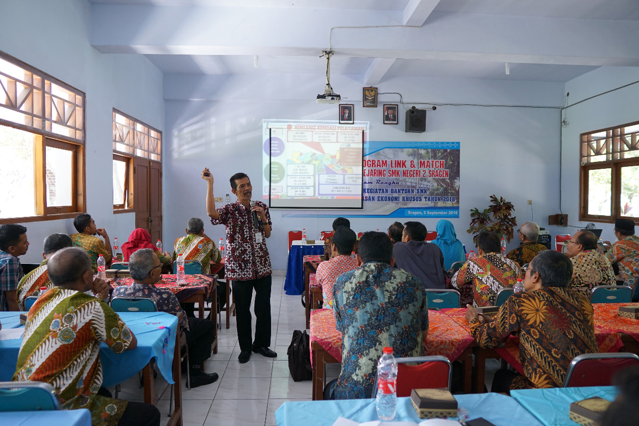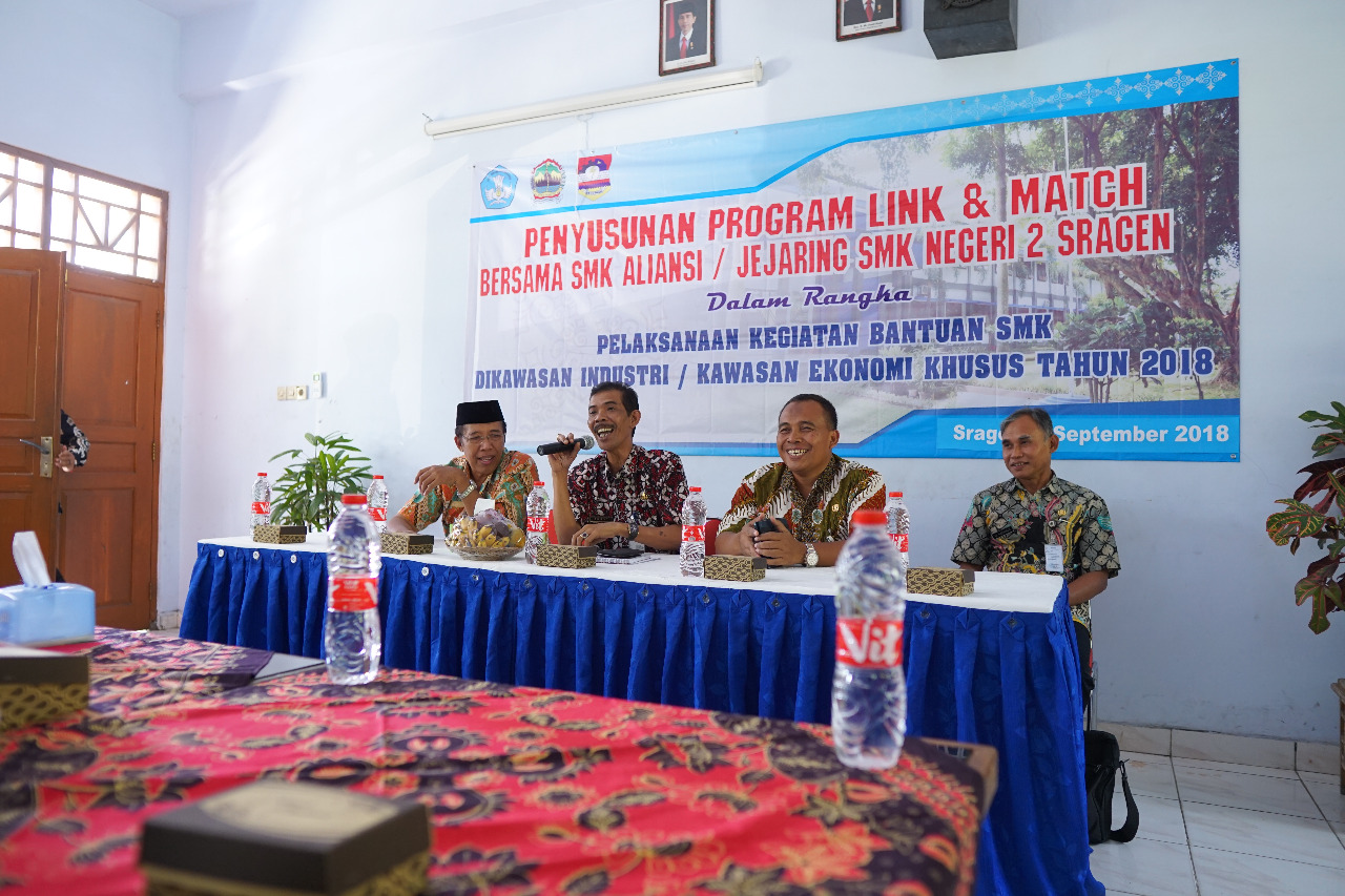Rabu, 5 September 2018, SMK Negeri 2 Sragen menyelenggarakan kegiatan Penyusunan Program Link and Match bersama SMK Aliansi dan Jejaring SMK Negeri 2 Sragen. Kegiatan yang dilaksanakan dengan mengundang SMK-SMK yang beraliansi dengan SMK negeri 2 Sragen, dihadiri Oleh bapak Sulistiyo, S.Pd, M.M selaku Kabid Pembinaan SMK Dinas Pendidikan Provinsi Jawa Tengah.