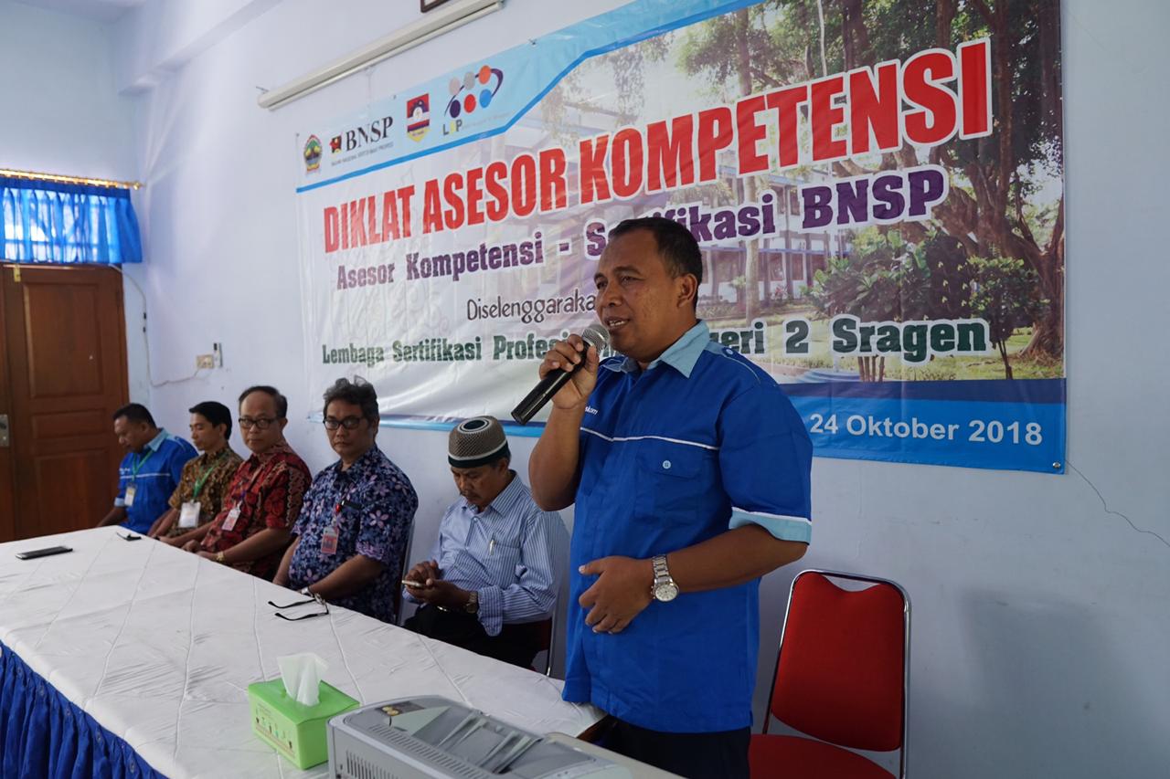 Diklat asesor yang diikuti oleh 24 peserta dari SMK se Jawa Tengah dibuka hari Sabtu, 20 Oktober 2018 oleh Pengawas SMK Bapak Shodikin. dan sambutan langsung dari bapak kepala SMK N 2 Sragen bapak Sugiyarso, S.Pd, M.Pd