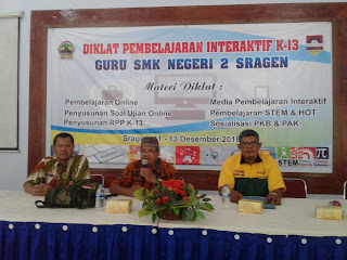 Tanggal 11-13 Desember 2018 SMK Negeri 2 Sragen mengadakan pelatihan pembelajaran Interaktif K13. Dalam kegiatan diklat yang merupakan program kerja dari Wks. Kerenagaan, dan dalam rangka meningkatkan kompetensi para guru dalam membuat RPP, membuat media pembelajaran interaktif, membuat soal CBT, pembelajaran online. Kegiatan yang dibuka langsung oleh beliau Kepala Cabang Dinas Pendidikan Wilayah VI Kasi SMK ibu Dra. Marfuah, M.Pd berlangsung lancar, dan penuh antusias.