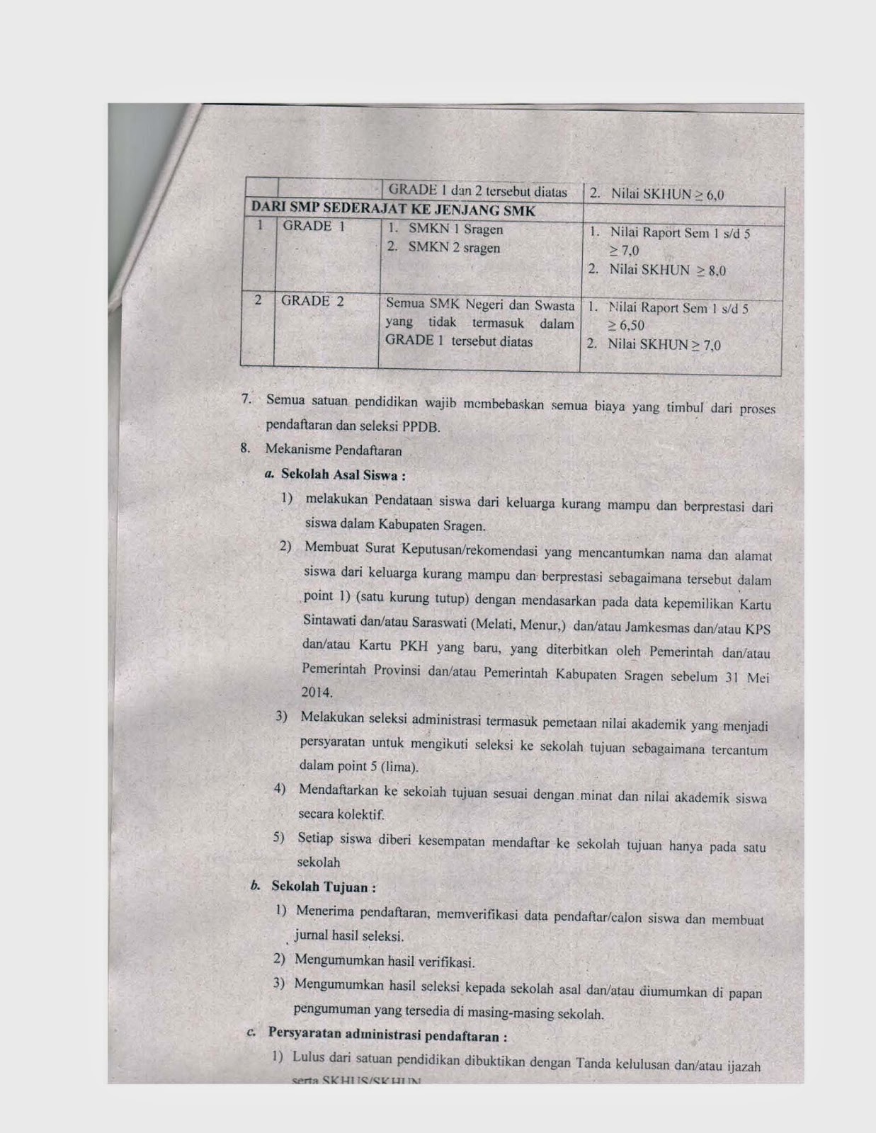 Berdasarkan Surat Kepala Dinas Pendidikan Kabupaten Sragen Nomor 422.1/1473/12/2014 Tentang Petunjuk Pelaksanaan PPDB Offline , PPDB Online Dan PPDB Bagi Calon Siswa Kurang Mampu, Tahun Pelajaran 2014/2015 Di Satuan Pendidikan Kabupaten Sragen. maka Ketentuan PPDB Offline untuk siswa dari keluarga kurangmampu Tahun 2014/2015 sebagai berikut :
