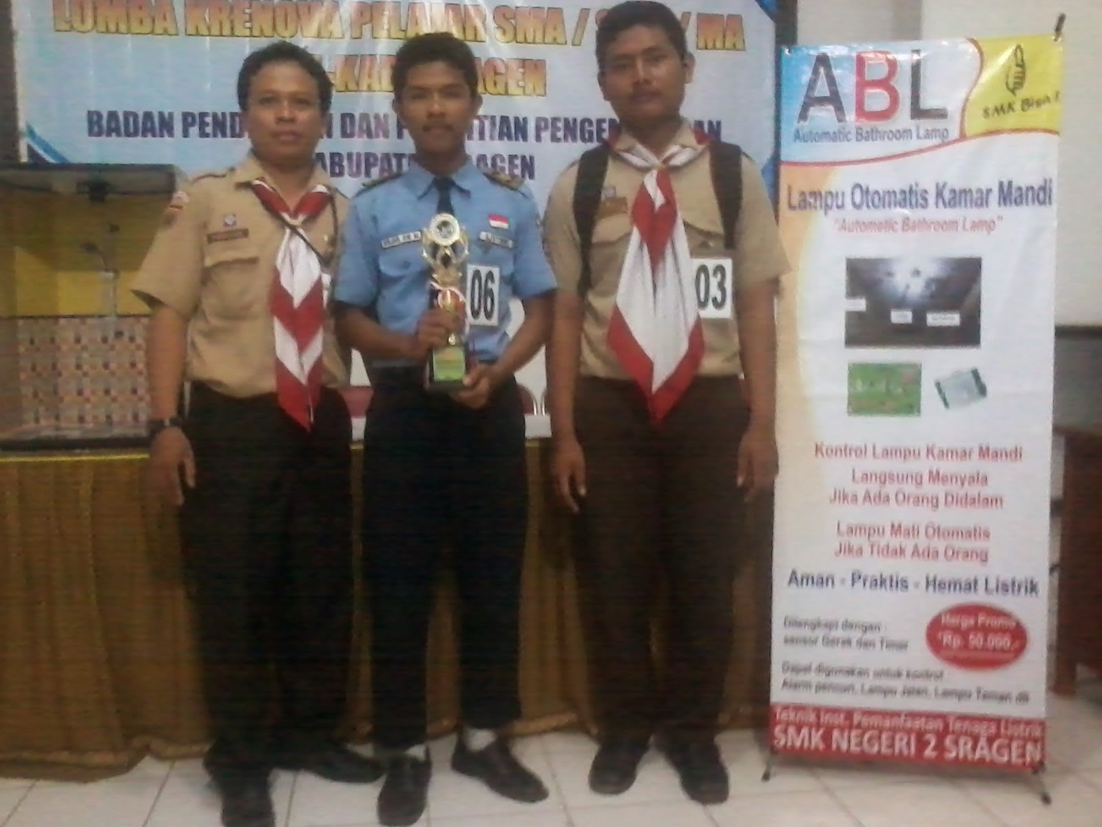 Siswa Jurusan Teknik Instalasi Tenaga Listrik tersebut atas bimbingan Bp. Rokhmad Astika T, berhasil menciptakan ABL (Automatic Bath Room Lamp), alat yang berfungsi untuk mengatur lampu kamar mandi, yang akan menyala jika ada orang di dalam Kamar mandi, dan akan mati sendiri jika tidak ada orang.