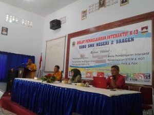 Tanggal 11-13 Desember 2018 SMK Negeri 2 Sragen mengadakan pelatihan pembelajaran Interaktif K13. Dalam kegiatan diklat yang merupakan program kerja dari Wks. Kerenagaan, dan dalam rangka meningkatkan kompetensi para guru dalam membuat RPP, membuat media pembelajaran interaktif, membuat soal CBT, pembelajaran online. Kegiatan yang dibuka langsung oleh beliau Kepala Cabang Dinas Pendidikan Wilayah VI Kasi SMK ibu Dra. Marfuah, M.Pd berlangsung lancar, dan penuh antusias.