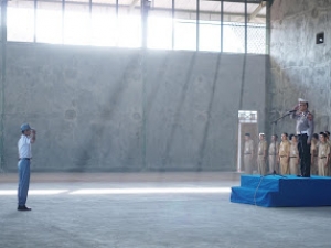 AKP Sugiyanto Kasatlantas Polres Sragen memimpin apel pagi di SMK N 2 Sragen