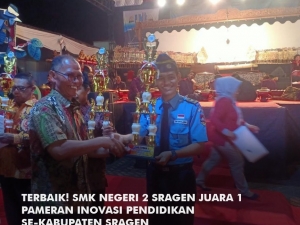 SMK Negeri 2 Sragen berhasil meraih juara 1 kategori stand terbaik ajang pameran inovasi pendidikan yang diadakan oleh Kabupaten Sragen. Penyerahan piala di Gedung Sasana Manggala Sukowati Sragen pada Rabu malam, 17 Mei 2023. Juara 1 ini diraih berkat inovasi yang dilakukan oleh SMK Negeri 2 Sragen dalam meningkatkan kualitas pendidikan di sekolah.