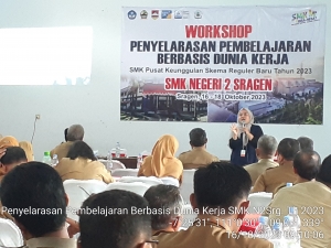 Sragen, 16-18 Oktober 2023, SMK Negeri 2 Sragen menyelenggarakan Workshop penyelarasan pembelajaran berbasis dunia kerja. Kegiatan ini SMK Negeri 2 Sragen bekerjasama dengan PT. Maju Bersama dan PT. Solo Abadi Indonesia. Dalam kegiatan ini, memberikan gambaran bagaimana dunia kerja itu sebenarnya, dan kompetensi apa yang harus dimiliki siswa ketika nanti masuk di dunia kerja.
