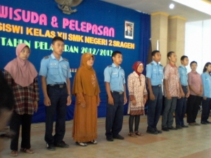 SMK Negeri 2 Sragen, hari ini, Rabu, 29 Mei 2013. Menyelanggarakan kegiatan perpisahan kelas XII di gedung Kartini Kab Sragen. Kegiatan yang dihadiri seluruh Guru, Karyawan, Siswa kelas XII beserta orang tua/wali.