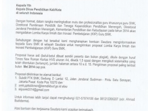 Lewat media ini saya mengajak teman-teman guru produktif untuk segera menyusun proposal untuk mencoba keberuntungan mendapatkan minimal dana 5 juta untuk mengadakan penelitian yang dapat mernghasilkan KTI. Dengan senang hati kalau ada inisiasi dari mana saja kalau program pengusulan proposal ini dikoordinir secara baik untuk memperbesar peluang diterima dan syukur-syukur masuk finalis dan menjadi juara. Tetapi semua keputusan saya kembalikan ke teman-teman guru SMK, dan yang pasti ada 2 kemungkinan kalau berniat mengusulakn proposal yaitu DITERIMA dan DITOLAK daaaan hanya 1 kemungkinan bagi yang tidak mengusulkan yaitu DITOLAK. Berani menerima tantangan? Silahkan dipelajari lampiran undangan ini. Joe