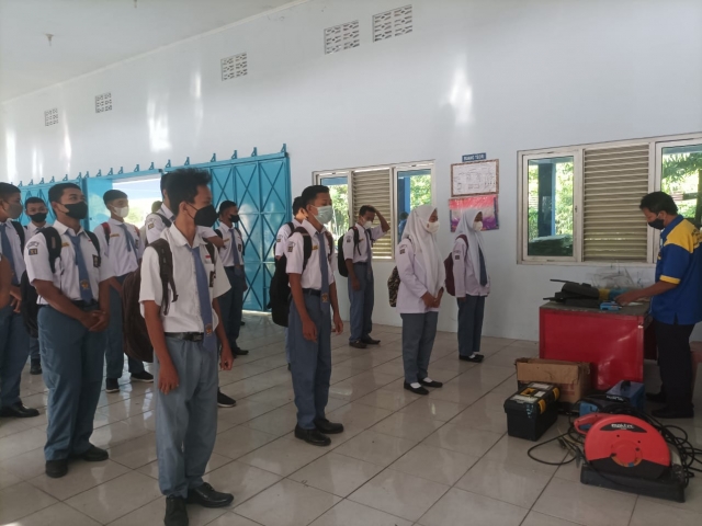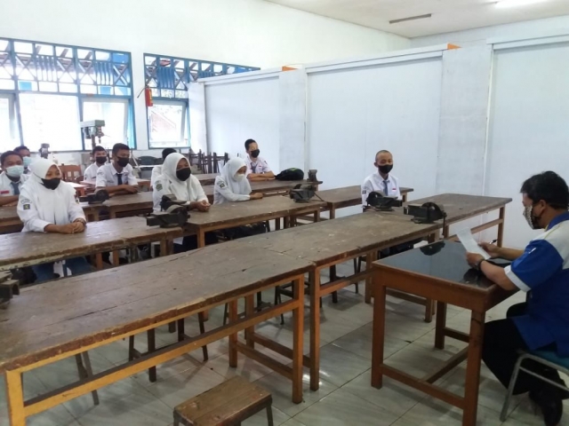 ![]() Pembelajaran di bengkel dengan protokol kesehatan ketat | ![]() Siswa Persiapan Belajar PTM di bengkel |